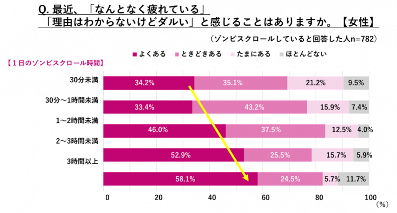また、「最近、『なんとなく疲れている』『理由はわからないけれどダルい』と感じることがあるか」という質問に対して、女性の約87%が「ある」と回答しました。ゾンビスクロールを長時間行っている人ほど、その割合が高くなる傾向となっており、ゾンビスクロールの背景には、自覚しにくい“見えない疲れ”が関係していることがうかがえました。