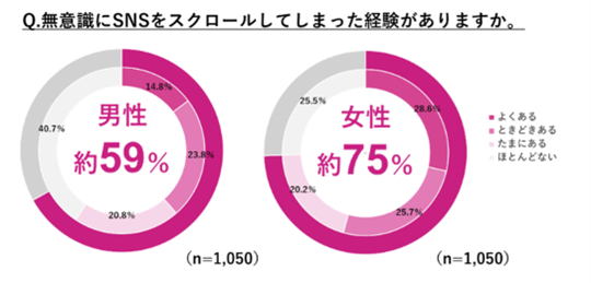 「無意識にSNSをスクロールしてしまった経験があるか」という質問に対し、約75%の女性が「経験あり」と回答し、3人に2人が自覚のないままゾンビスクロール状態に陥っている実態が明らかになりました。男女別に見ると、男性は約59%であり、女性の方がゾンビスクロールをしている割合が高い結果となりました。